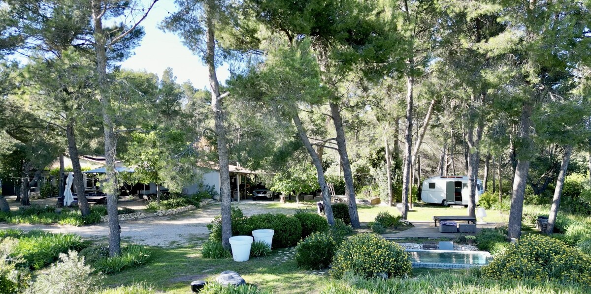 La Planque des Alpilles, holiday rental for 4 people (6 during summertime) with a private swimming pool (4 x 2,5 m) in a unique setting in the middle of olive trees, in the Alpilles. It is an autonomous (solar energy) holiday home, 2000m2 of land without fences and without neighbours with a superb view. Composed of a convivial living room-kitchen, 2 bedrooms with shower room, plus a vintage caravan as 3rd bedroom for two additional persons. Vegetable garden, terraces, bar, plancha, WIFI, Sonos.