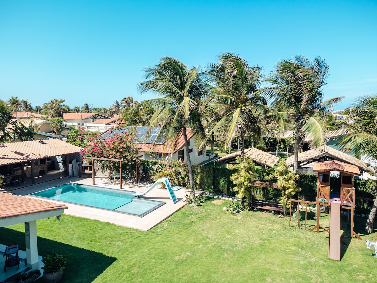 Ven y disfruta de unas vacaciones inolvidables en nuestro oasis a solo 300 m de la playa y cerca de los famosos acantilados de Beberibe en Ceará, Brasil. Amplia casa recientemente reformada con 7 dormitorios (6 son suites), todos con aire acondicionado, camas de matrimonio y ganchos para hamacas. 700 m² de superficie construida, piscina, zona de barbacoa, salón y comedor, y cocina totalmente equipada. Diviértete con comodidad, pero ten en cuenta que no se permite música alta, fiestas ni bandas en vivo, ya que este es un barrio residencial.