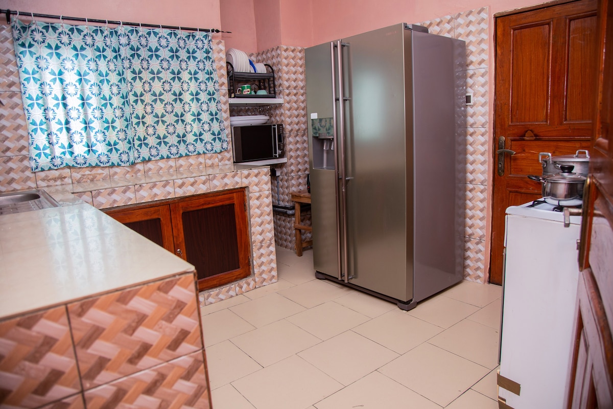 El alojamiento en casa de Fèmi se encuentra en Togbin, un nuevo barrio en las afueras de Cotonú en pleno auge, a 10 minutos del aeropuerto internacional de Cotonú por la carretera de los melocotones, playa a 800 m. Barrio tranquilo y apacible. Hay muchos bares, restaurantes y supermercados en los alrededores. Totalmente climatizado el alojamiento tiene un salón, una cocina equipada abierta a la sala de estar, 2 dormitorios con aire acondicionado y vestidor, un baño con ducha, lavadero, terraza, plazas de coche.