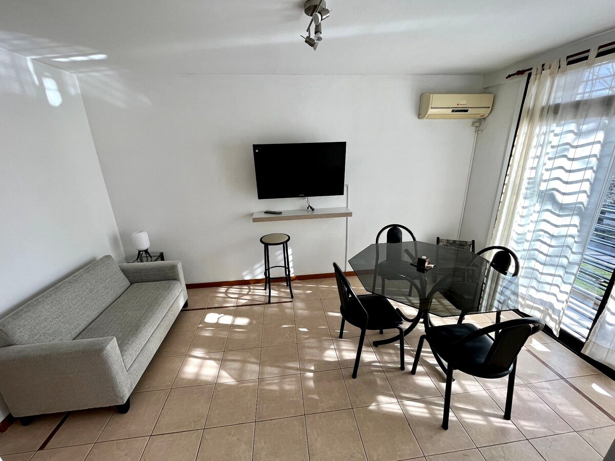 Departamento de un dormitorio, ubicado a 10 minutos del centro de la ciudad. Cuenta con todos los servicios para pasar una gran estadia. La segunda cama se encuentra en el livin, debajo del TV donde se observa un mueble color rojo.