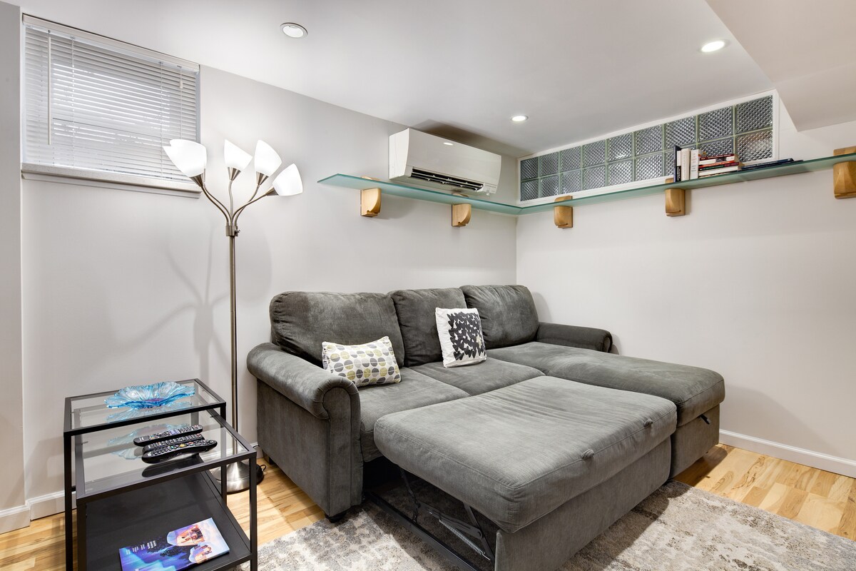 Nuestro espacioso y sorprendentemente luminoso medio sótano de Bethesda está ubicado en un barrio tranquilo a pocos minutos de Walter Reed, NIH y el metro. Las grandes ventanas ofrecen una vista a un patio bordeado de hortensias y árboles de hoja perenne; el dormitorio tiene una cama tamaño queen, un televisor inteligente Samsung y un escritorio. El cabezal de ducha Kohler en el baño ofrece una presión firme y la mininevera y el microondas están a mano para los aperitivos. Número de licencia de alquiler de corta duración STR25-00162. Nota: No hay cocina ni lavadora/secadora.