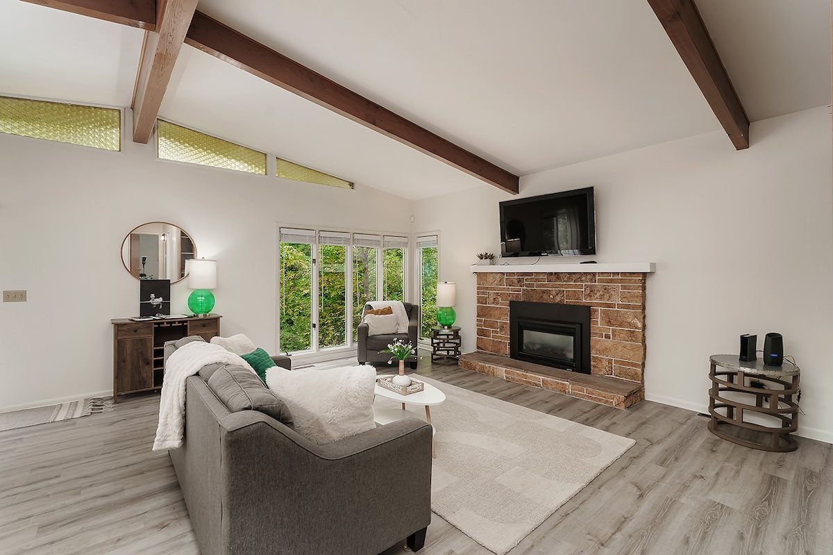 Amplio apartamento de dos dormitorios y 1 baño en el sótano con cocina completa (estufa, nevera/congelador, microondas, tostadora, utensilios, cubiertos, etc. El salón tiene una bonita chimenea de gas independiente, que hace que el apartamento sea muy acogedor. También hay un televisor con un Amazon Firestick, que permite a los huéspedes acceder a Netflix, Hulu, YouTube, etc. Cada dormitorio tiene una cómoda cama tamaño queen, tocador y chimenea eléctrica para mayor comodidad y ambiente.