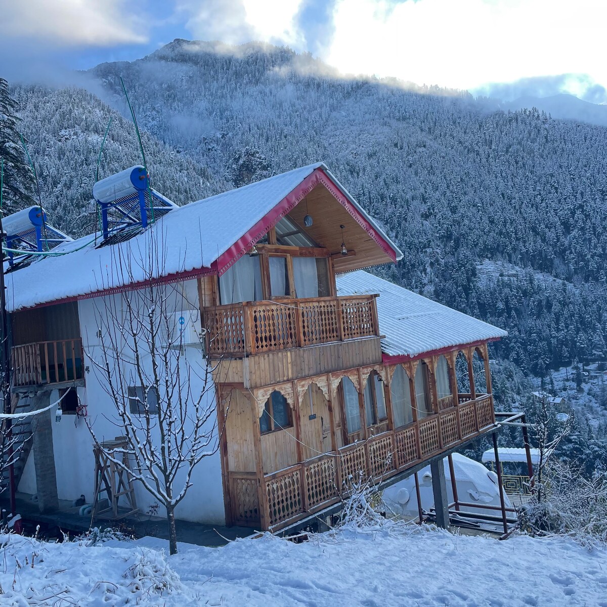 “Into the Woods Eco lodge in the middle of Apple orchards and forest with stunning views.” ★ Rustic Pinewood Architecture ★ Panoramic Views of Forests & Mountains ★ Eco-friendly Stay . ★ Wi-Fi ★ Power Backup ★ Fresh, Home-style organic Food ★ Bonfire Area ★ Indoor Fireplace & Dining Area ★ Organic Garden Surroundings Please note:- There is 500 meters trek down from parking spot to reach at property, Your luggage will be carried by us.