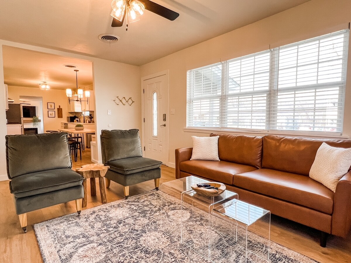 Te encantará sentarte en el porche delantero y ver a los peatones, ciclistas, etc. al otro lado de la calle. Sala de estar abierta al comedor y a la cocina. El dormitorio principal tiene ducha a ras de suelo. También hay un baño completo en el pasillo. Wifi y TV de pantalla ancha con streaming. Mucho espacio en el armario. Cocina totalmente amueblada. Frente a una hermosa pista para caminar, el campo de béisbol Mike Deak McAlester HS y los campos de fútbol. Calle bien iluminada. Garaje pequeño y estacionamiento adicional en la entrada.