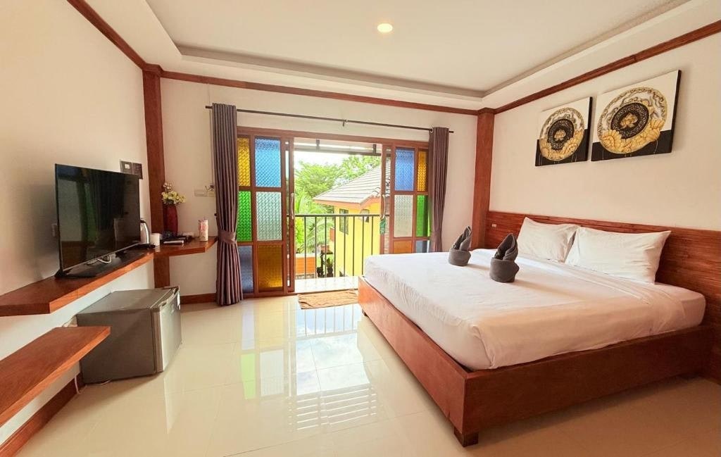 ห้องพักสไตล์บาหลีโคซี่ โดดเด่นด้วยประตูและหน้าต่างทรงโค้งไม้ ให้ความรู้สึกอบอุ่น เป็นส่วนตัว และผ่อนคลาย ตกแต่งด้วยวัสดุไม้แท้ โทนสีธรรมชาติ และแสงไฟวอร์มไลต์ สร้างบรรยากาศเหมาะสำหรับการพักผ่อนอย่างแท้จริง ภายในห้องมีเตียงนอนขนาดใหญ่ ผ้าม่านสีเขียวเข้มสไตล์รีสอร์ต โต๊ะทำงาน/โต๊ะเครื่องแป้ง ทีวี และห้องน้ำในตัว เหมาะสำหรับคู่รัก นักเดินทาง หรือผู้ที่ต้องการพักผ่อนแบบสงบ ๆ ใกล้ Fisherman’s Village เกาะสมุย