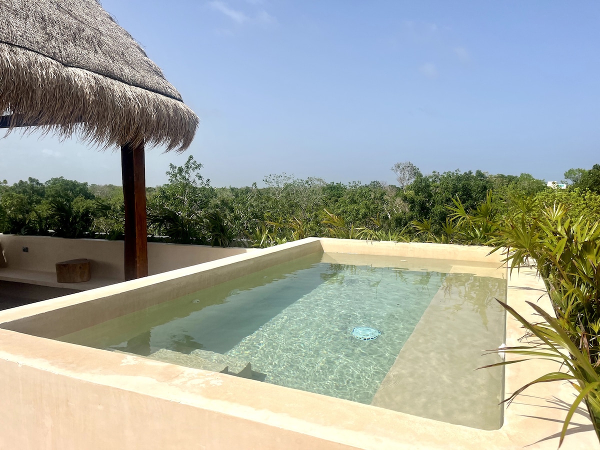 Stunning loft apartment with direct access to pools, near Tulum center and only a few minutes from the spectacular beach and Tulum beach clubs. Enjoy several stunning swimming pools, a roof top pool, sun beds, nice gym, 24/7 staff, strong A/C, elevator, fast Wifi (400 Mbps), blackout curtains, 55" smart TV, a fully equipped kitchen and private parking. Experience outdoor dining or just drinks with beautiful panoramic views at the roof top restaurant
