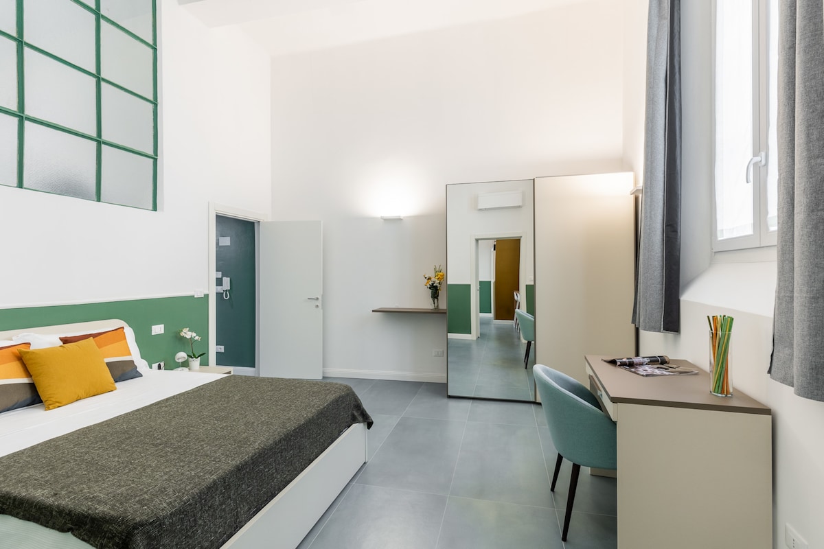Elegante y silencioso estudio situado en un edificio típico del centro histórico de Bolonia, completamente renovado y amueblado en 2020. El apartamento consta de un amplio y luminoso estudio con una romántica chimenea de piedra natural. Cuenta con una cocina americana con placa de inducción y está totalmente equipada. El baño está equipado con una gran ducha y hay una lavadora a disposición de los huéspedes. El apartamento está totalmente climatizado y equipado con Smart TV (40 pulgadas) y wifi.