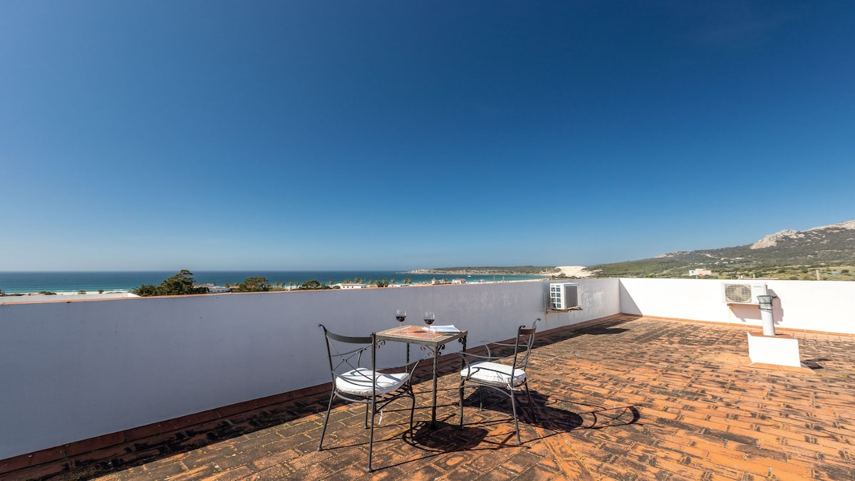 Precioso ático con amplia terraza y encantadoras vistas al mar. Loft de 50 m2 + 10 m2 de terraza con una cama de matrimonio para 2 personas. Está muy cerca de la playa de Los Lances (1 min. caminando) y de los bares y restaurantes del paseo marítimo. También está muy bien situado para visitar el centro (300 m.) o los supermercados y tiendas de Tarifa (200 m.) Perfectamente equipado incluso para vivir una larga temporada (aquí vivo yo durante todo el invierno) Incluye parking privado
