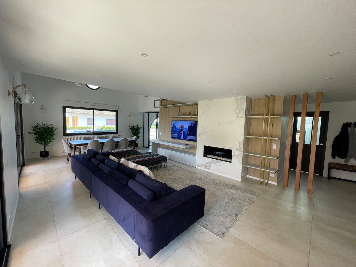 Agréable T5 bio de plein pieds intégral en RDJ aux portes de Bayonne et à proximité des plages. Idéal vacances, retrouvailles en famille, séminaires, télétravail, immersion. Grande pièce à vivre et 4 chambres longées d'une grande terrasse sud sans vis-à-vis, surplombant une petite prairie arborée (SPA sur demande hors saison ... et chevreuils sous réserve d'un peu de chance et de discrétion). Commerces, bus, pistes cyclables et lac de Castillon à proximité immédiate. English speakers welcome.