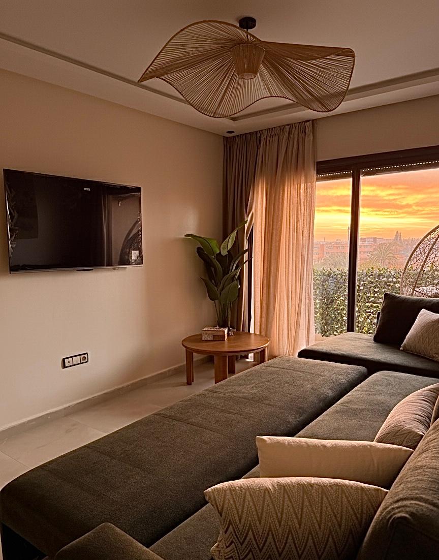 Vue imprenable sur les montagnes de l'Atlas, couchez de soleils et vue sur l'ancienne médina, décoration chaleureuse, qualité de literie et linge de maison, c'est ce qui vous attend dans cet appartement de 110m² situé à proximités des grands axes de la ville. Supermarché, boulangerie et pharmacie en bas de la résidence. Parfait pour les couples, les voyageurs en solo et les voyageurs d'affaires.