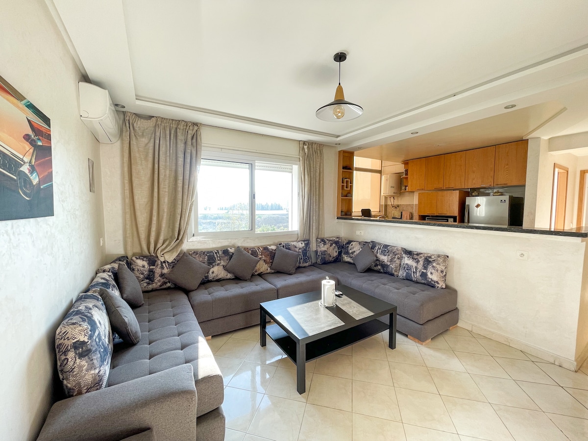 Relájese en este tranquilo y elegante apartamento, cerca de : (Distancia en coche) - A 5 min del aeropuerto internacional de Tánger - A 5 min de la Zona Franca de Tánger. - A 5 min del Centro Hospitalario Universitario (CHU). - 5 min de la Facultad de Medicina - 5 min del Bosque Diplomático. - 8 min de la nueva playa de la ciudad, Ibn Battuta. - 16 min de las Cuevas de Hércules - 30 min de la ciudad de Asilah Apartamento para no fumadores.
