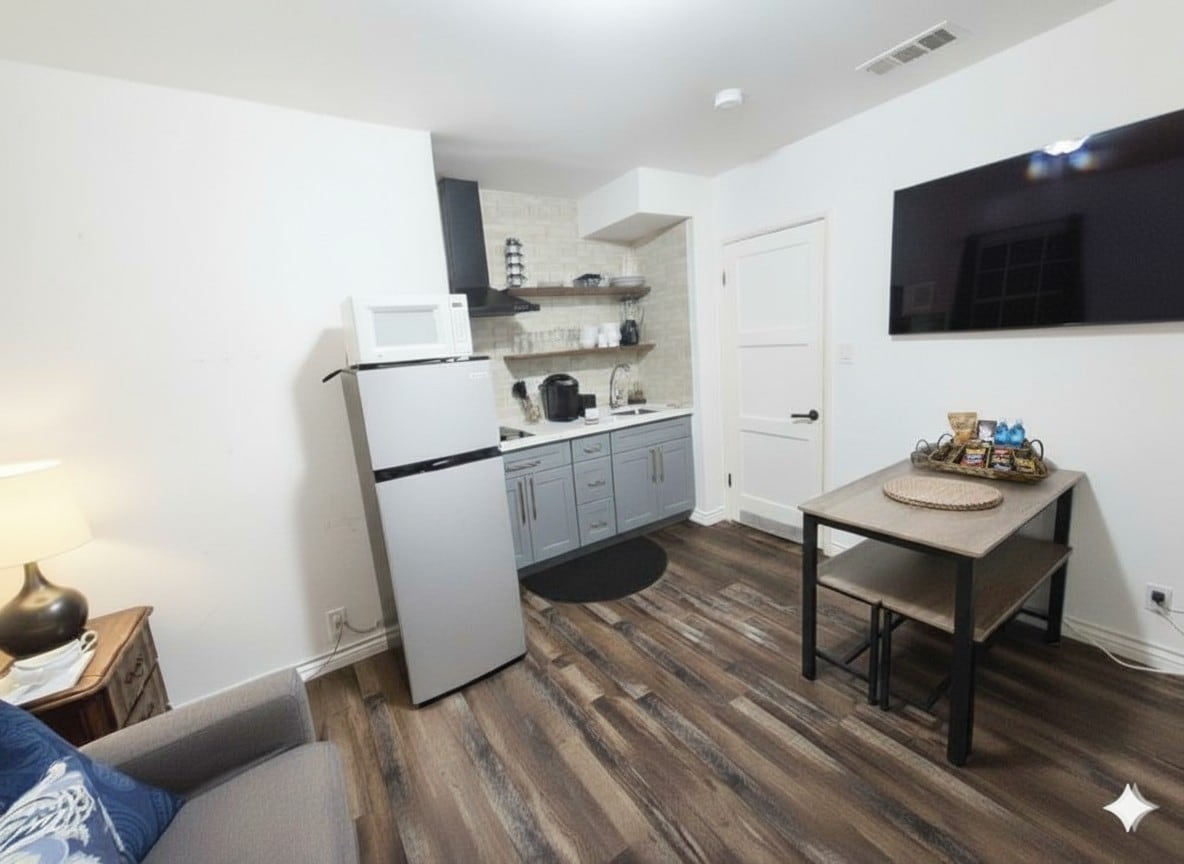 Aproximadamente 650 pies cuadrados. Estudio. Cama king cómoda. Capacidad para 2 personas cómodamente, opcional para un 3er huésped a tu discreción. Amplio espacio en el armario. Smart TV para que puedas iniciar sesión en tus aplicaciones de televisión favoritas. Sofá, mesa de centro y cómoda en el dormitorio/sala de estar de concepto abierto. Cocina completa. Wifi rápido. Lavadora/secadora (detergente) gratuita en la unidad. Refrigerador con máquina de hielo. Olla caliente de hervidor de vidrio (café instantáneo). Completamente desinfectado y limpio. Este no es un lugar compartido. Disfruta