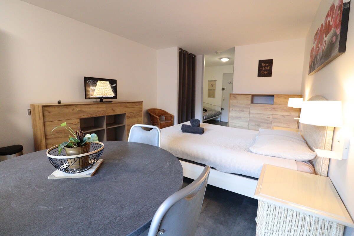 Estudio reformado en la tercera planta de un edificio de 5, con ascensor. Reformado con un estilo moderno, perfectamente equipado para 3 a 4 personas (1 sofá cama y 1 mueble cama de 140) Pequeño balcón Armario de esquís y aparcamiento privado en el sótano accesible directamente por ascensor Transporte gratuito al telecabina del Olimpo y al centro al pie del edificio. Se proporcionan sábanas, toallas y paquete de limpieza adicional.