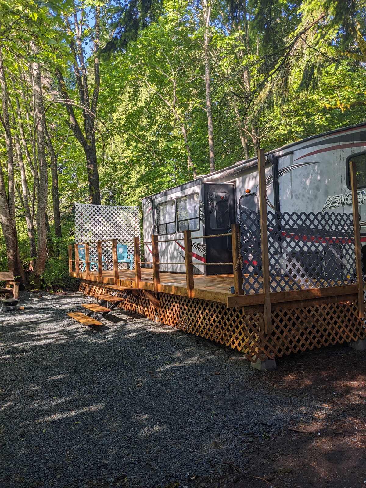 ¡Perfecto para una escapada! Luminoso, cálido y acogedor, nuevo 5to remolque de cuatro estaciones enclavado en las montañas. Este espacio se encuentra en una ubicación privada y cuenta con cocina completa, cocina al aire libre con bar, baño con ducha, calentador de propano, televisores de 40 pulgadas, Netflix, wifi, chimenea eléctrica, cochera cubierta y una gran terraza. También encontrarás una bañera de hidromasaje de leña hecha a medida a pocos pasos de la puerta. El centro de Nelson está a 5 minutos en coche y a 20 minutos de la estación de esquí Whitewater.