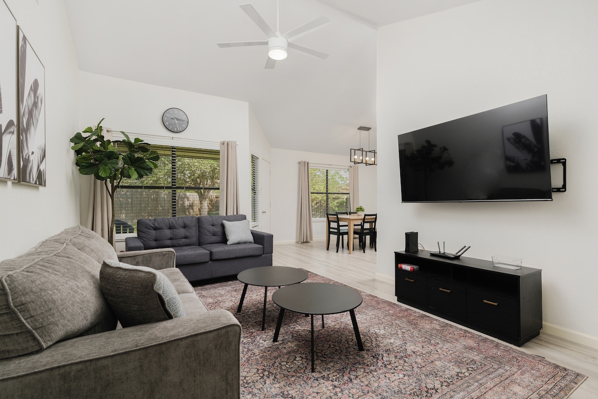 Tanto a los golfistas como a los no golfistas les encantará este condominio loft. La unidad cuenta con un dormitorio arriba con un tocador y un cofre con mucho espacio de almacenamiento. El baño con bañera/ducha también está arriba. La cocina está totalmente equipada con cocina eléctrica y microondas. Disfruta de una taza de café en el patio exterior. La unidad incluye lavadora y secadora. Internet es rápido y el aire acondicionado central es superfrío. Hay mucho aparcamiento gratuito justo fuera de la unidad. ¡Ideal para estancias largas!