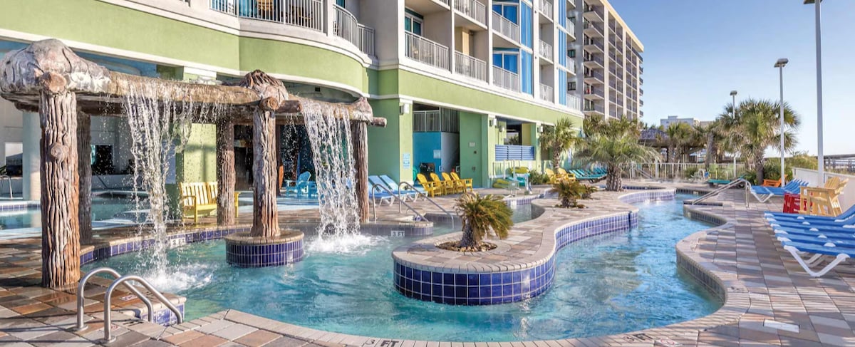 Dear guest, you must be 21 years or older to check in. Discover the charm of Cherry Grove Beach, South Carolina’s top coastal gem, where this sleek, modern resort puts you steps from soft sands and sparkling waves. Spend your days floating down the lazy river or diving into ocean adventures like Jet Skiing and paddleboarding. Catch a sunrise at Cherry Grove Pier, tee off at top golf courses, or comb the beach for seashells and shark teeth.