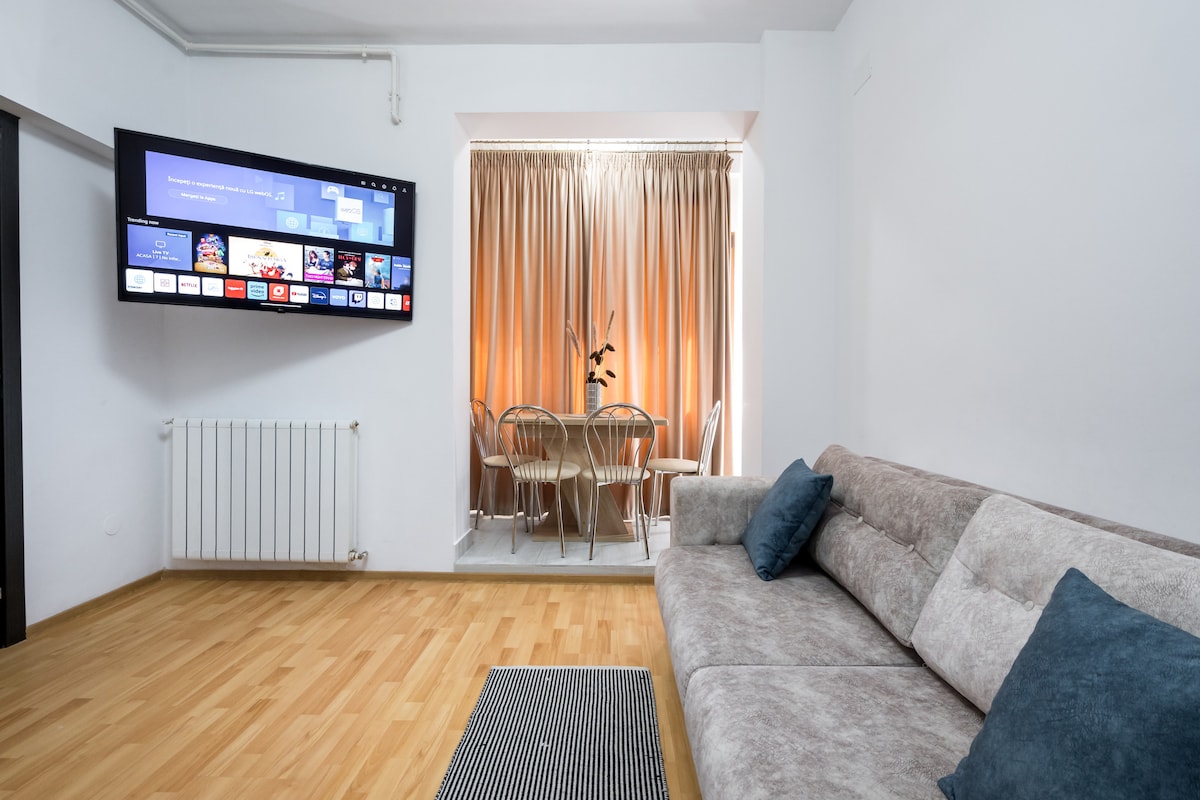 Quiet central apartment with terrace views, just a short walk from Old Town, museums, cafés and Sala Palatului. Newly renovated and designed for comfort, the flat offers high ceilings, fast Wi-Fi, self check-in, a dedicated workspace, air conditioning, a fully equipped kitchen and a queen bed. Ideal for couples, solo travellers and longer city stays who want to be close to everything without the noise. High ceilings apartments Bucharest *MAX HBO* SkyShowtime * Local TV