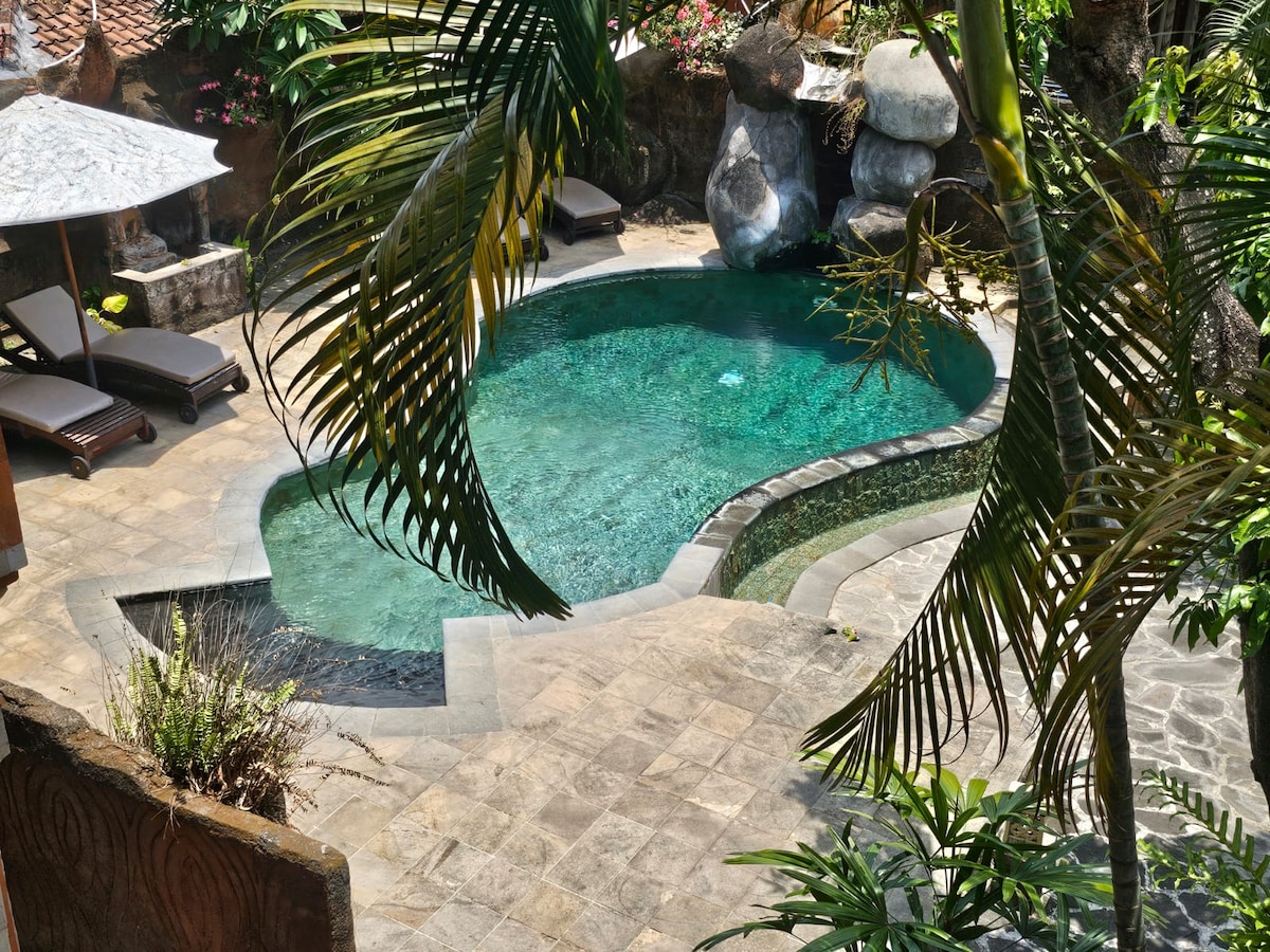 maravilloso lugar ubicado en el pequeño pueblo de Tejakula, exactamente en medio del jardín tropical. A solo 350 metros de la playa con arena volcánica. Tenemos la mejor vista de la cascada a unos 5 minutos en motocicleta y amanecer y también el seguimiento del atardecer en hermosas colinas de Tejakula.