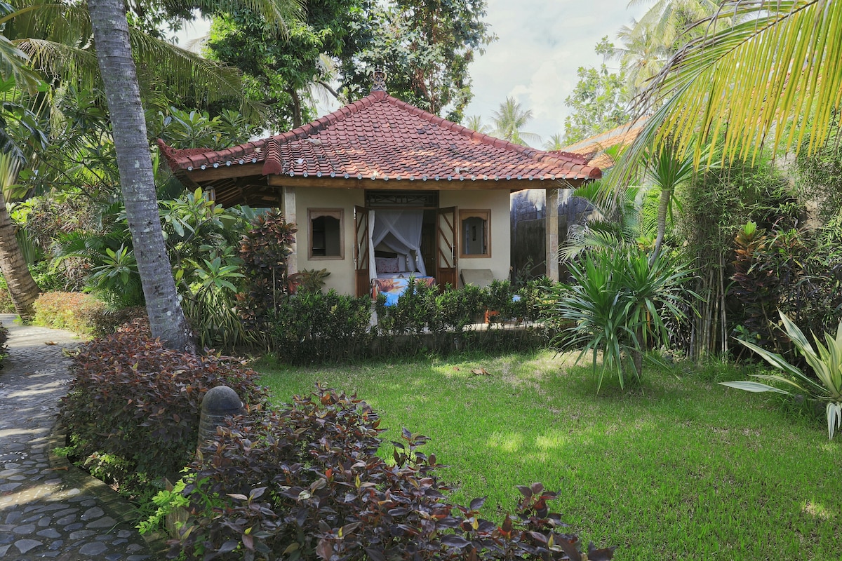 Sumérgete en confort tradicionales, completo con sábanas y toallas frescas, aire acondicionado y cómodas camas para una noche de sueño perfecta. Cada habitación incluye un armario y un toallero, además de un área privada de descanso al aire libre para relajarse. Camina dos minutos hasta la playa, donde puedes avistar delfines juguetones o disfrutar de los deliciosos restaurantes y warungs cercanos. No te pierdas las atracciones cercanas, como impresionantes cascadas y sorprendentes templos.