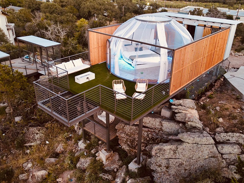 UDOSCAPE: un complejo ecológico único y conmovedor en Texas Hill Country. El centro vacacional tiene 11 cápsulas lujosamente amuebladas que van desde Deluxe, Deluxe-plus, Ultra-Lux, hasta Crown-Lux, todas ubicadas en una colina con excelentes vistas al campo de las colinas. Las comodidades incluyen piscina, parrillas, chimenea, hamacas, bañeras de hidromasaje dedicadas, cápsulas de masaje, etc. Las cápsulas están lujosamente amuebladas con lujosas sábanas, baño en suite, pequeña cocina, comedor, etc. ¡Prepárate para experimentar el camping como nunca antes!