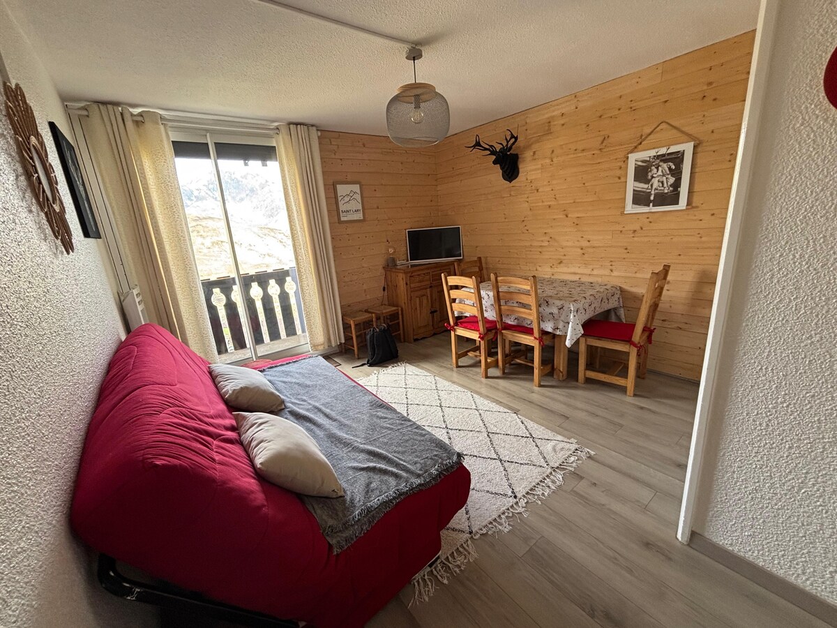 🏔️ Acogedor apartamento de 25 m² en Pla d'Adet (1700 m)– 5 personas – Al pie de las pistas ⛷️ Renovado, luminoso, con balcón con vistas al valle, aparcamiento 🛋️ Estancia con sofá cama (2 pers.) 🍳 Cocina equipada. 🛏️ Habitación con 3 camas 🚿 Cuarto de baño / WC 🎿 Taquilla de esquí segura en la planta baja Ideal para familias, parejas o amigos que buscan comodidad, vistas y acceso directo a las pistas.