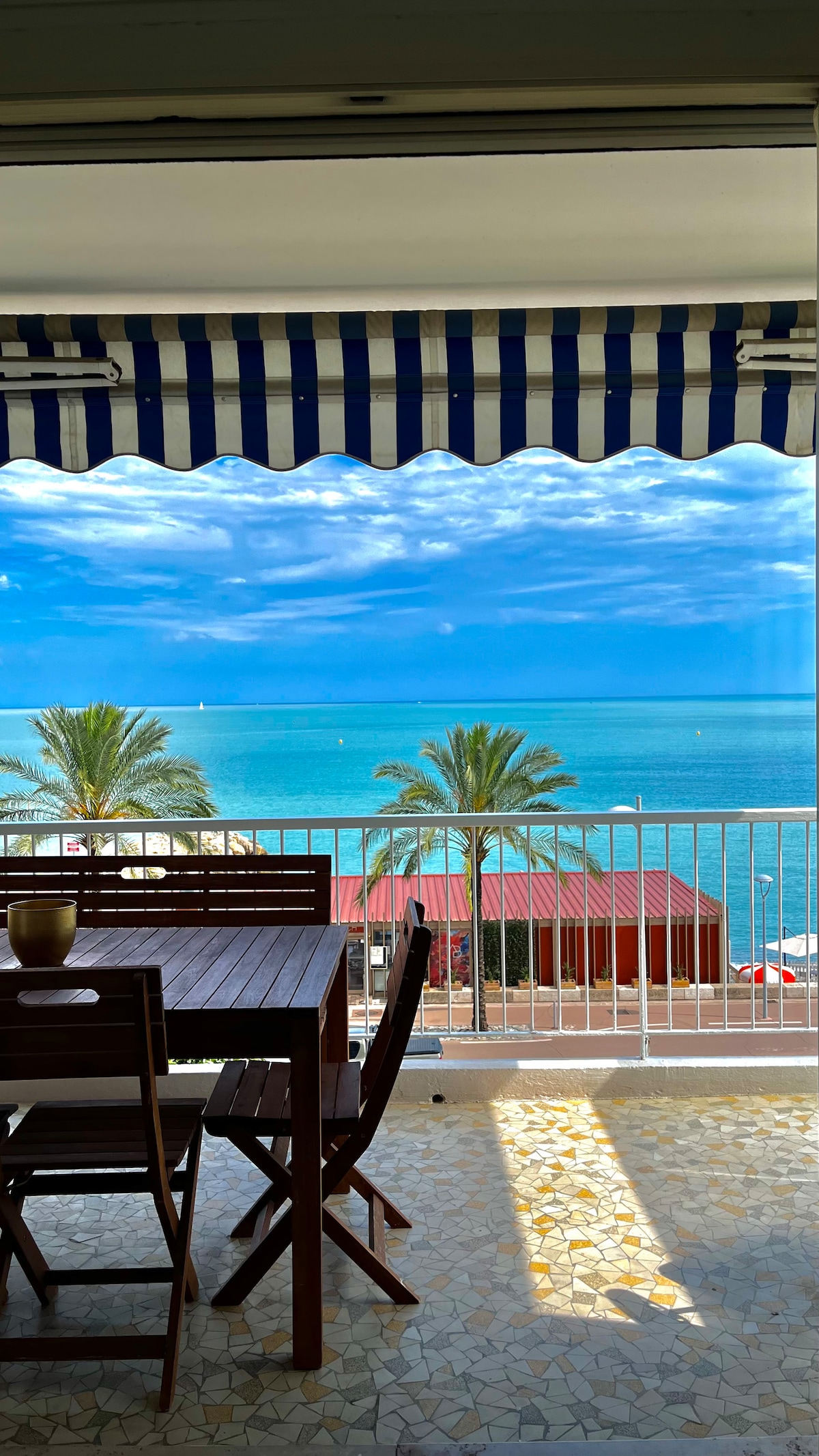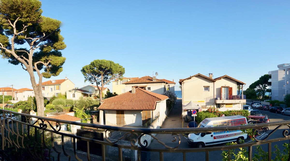 Este apartamento acogedor frente al mar, ideal para parejas, ofrece una vista relajante del mar. El apartamento está a 8 minutos en coche del aeropuerto y a 10 minutos a pie del hipódromo de Cagnes-sur-Mer y de las tiendas de la zona. Combina comodidad y tranquilidad. El luminoso salón tiene un sofá cama de alta gama y un televisor de pantalla plana. La cocina equipada incluye lavavajillas y cafetera Nespresso. No se cobra limpieza.