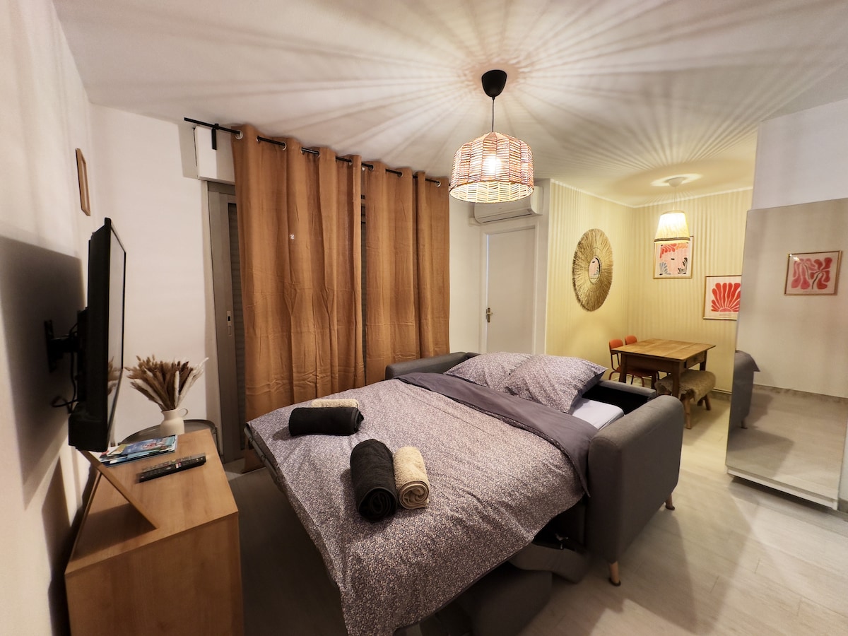 🌴 Descubre la Costa Azul en este magnífico estudio 🚉 ¿Sin coche? Estación de tren y autobús a dos pasos para explorar la región. 🐎 A 5 min: Hipódromo de la Costa Azul 🏖️ Playas, restaurantes y tiendas a poca distancia. 🌿 Estudio luminoso y tranquilo con balcón para sus momentos de relax. ☕ Nespresso gratis para empezar bien el día.