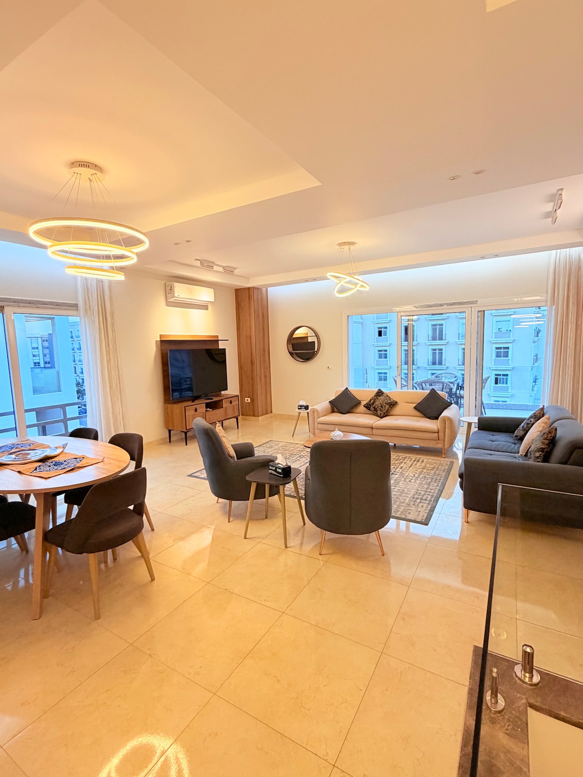 Disfruta del lujo en este apartamento de 3 dormitorios en un complejo seguro 24/7 en el Nuevo Cairo, a 25 minutos del aeropuerto. Cuenta con un dormitorio principal, televisores inteligentes, wifi de alta velocidad y muebles de primera calidad con un lujoso juego de comedor. Disfruta de piscinas compartidas, zonas verdes y unas vistas preciosas. Cerca de los mejores centros comerciales, cines, restaurantes y todo lo que necesitas. Perfecto para familias o estancias de negocios, reserva tu estancia ahora
