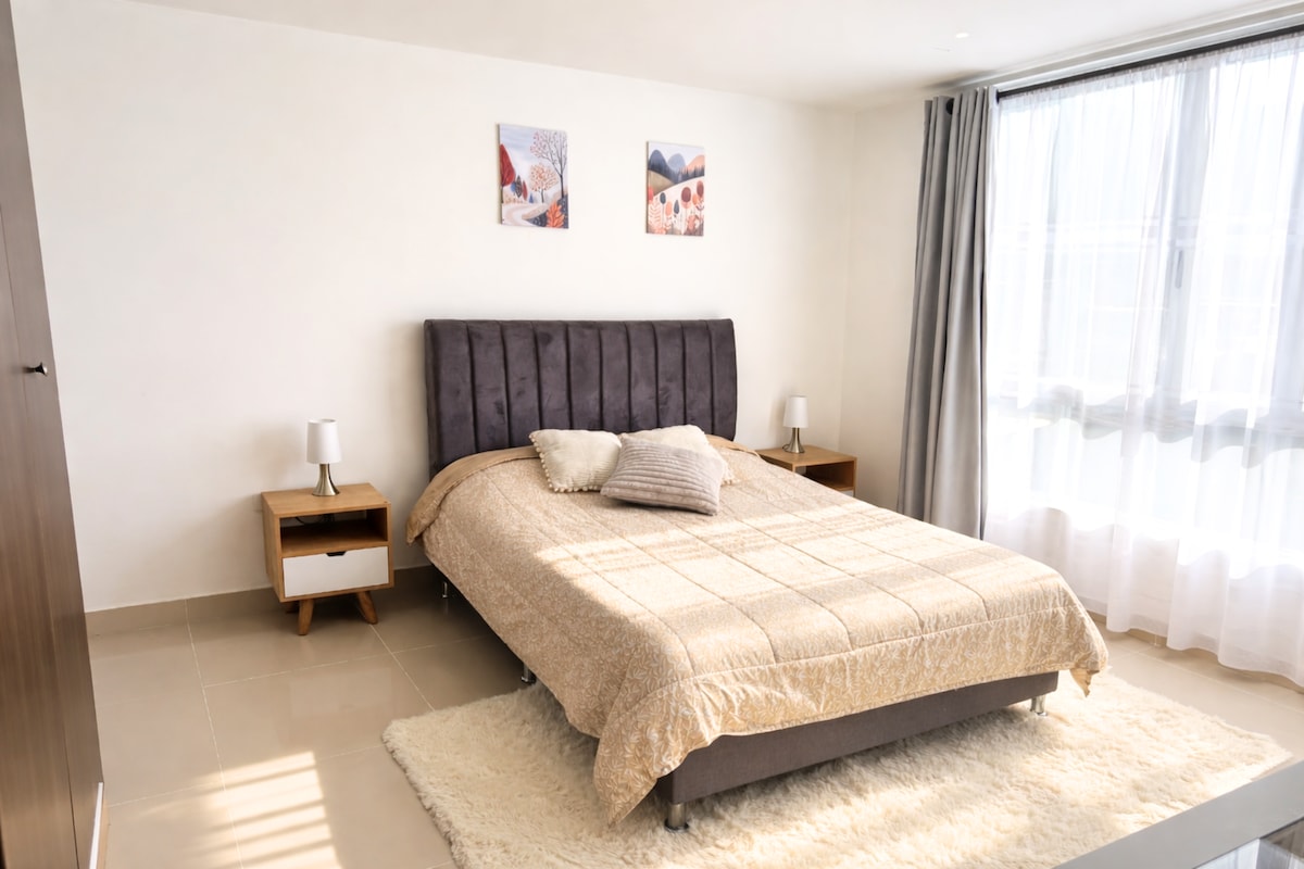 Apto cómodo y muy iluminado con una espectacular vista a las montañas. Cuenta con 2 habitaciones, 2 baños y 2 espacios de trabajo, ideal tanto para descansar como para trabajar de forma remota. En los días fríos podrás vivir la experiencia única de estar literalmente entre las nubes. El apartamento cuenta con internet de 300 MB y agua caliente para una estadía cómoda. En pleno centro de Cajamarca, con supermercado D1 cerca y a unos pasos del parque principal, restaurantes y bancos.