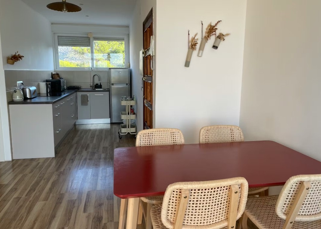 Charming house of 100m2, with interior patio with a small private pool, terrace tree-filled and rooftop sea view. Completely renovated in May 2018 and decorated in an ibicenco style, it is located in a quiet residence with a large pool overlooking the sea. It is 10 mn walk from Cala Tarida beach and 15 mn walk from Cala Moli beach, one of the most beautiful areas of the island. It has 3 bedrooms, 3 bathrooms and a fully equiped kitchen open to a spacious living / dining room. Ideal for families.