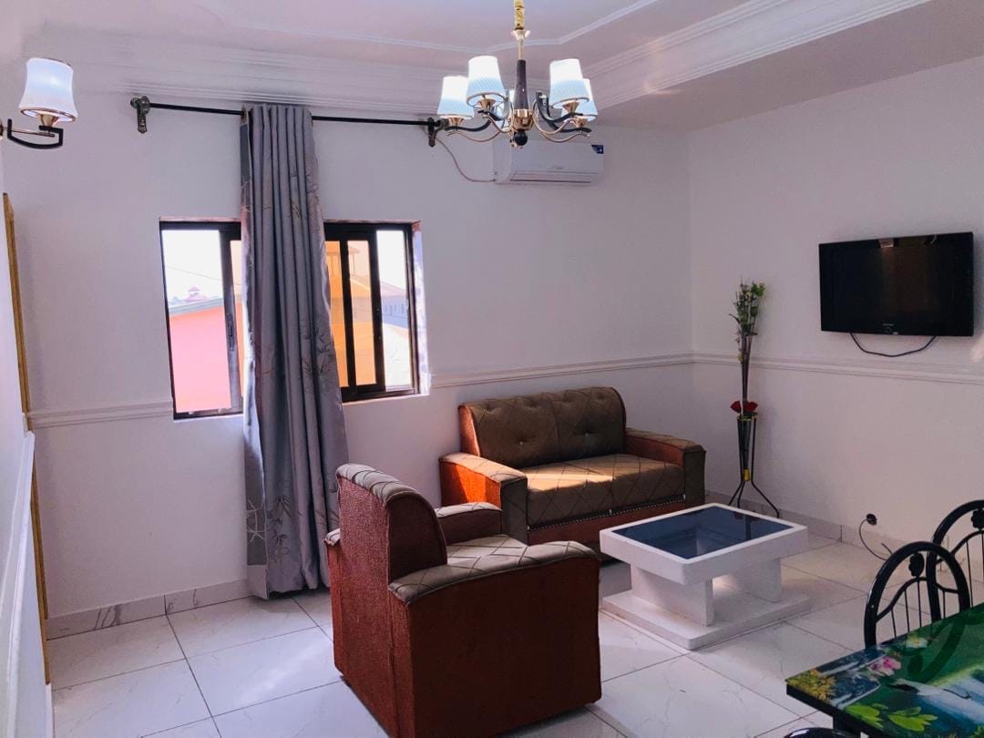 Bonito apartamento de 2 dormitorios con 2 baños situado en la planta baja de un edificio nuevo. Decoración de estilo contemporáneo combina encanto y pureza. Cómoda sala de estar, gran pantalla de TV con parábola, wifi gratuito. Cocina equipada ( lavadora, nevera, microondas, cocina de arroz, horno de cocina, utensilios de cocina ) el apartamento está en una zona tranquila y pequeño mercado Odza a 20 minutos del centro de la ciudad. Estacionamiento seguro las 24 horas Tenemos un restaurante en el lugar en el menú regional y precio bajo
