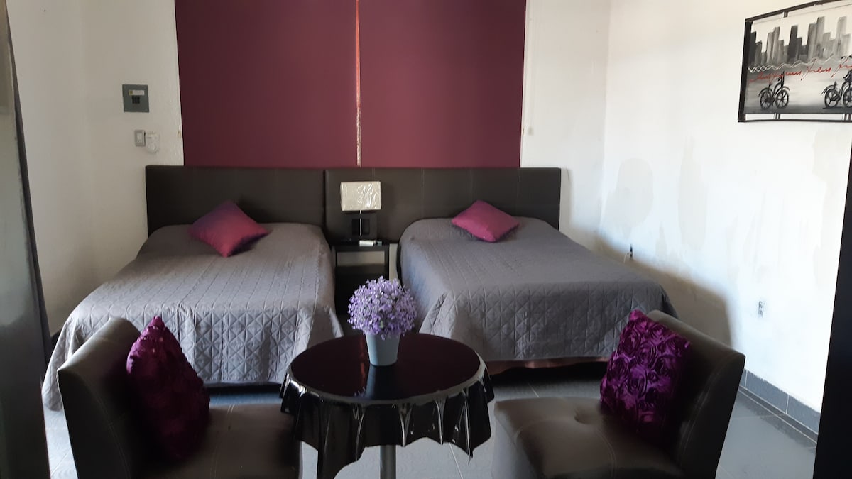 El alojamiento: El departamento esta completamente equipado, cuenta con Wif-fi, T.V por cable, 90 canales, aire acondicionado, baño independiente, entrada independiente, estufa, refirgerador, cama matrimonial refrigerador, sillón, meseta, sillas periqueras. Los acabados son completamente de primera calidad cuenta con un balcón, para poder salir a tomar aire. Actualmente estamos haciendo más departamentos al final del pasillo, pero nos adaptamos a los horarios de salida de las personas.