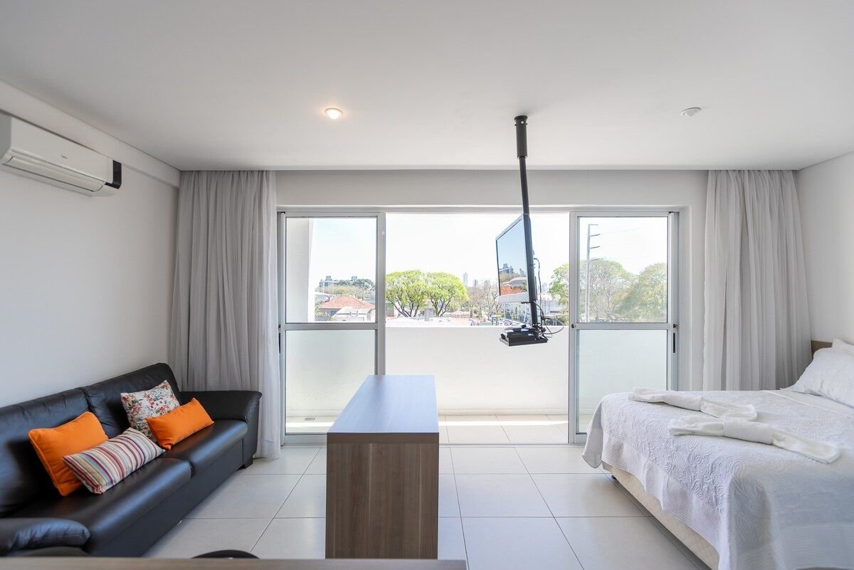 Estudio completo para (2) dos personas, con plaza de aparcamiento, situado a (1) una manzana de la PUC. Con aire acondicionado, wifi de gran velocidad, Smart TV, cama doble, cocina equipada, ropa de cama y baño, champú, jabón, escritorio, secador de pelo, plancha, junto a Shopping Estação, Carrefour y otros mercados, panaderías y restaurantes. Es súper cómodo con toda la seguridad, con llegada/salida autónoma.