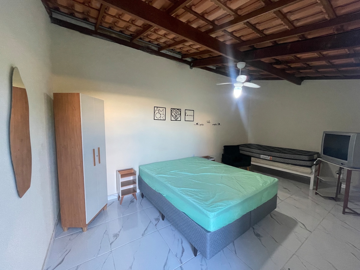 Relájate con toda la familia en este hogar tranquilo, un entorno súper cómodo y seguro. Compuesto por dos dormitorios, uno en suite, ambos con aire acondicionado con aire acondicionado, sala de estar, cocina completa, área de servicio con lavadora, TV wifi, hamaca para descansar. * NO PROPORCIONAMOS TOALLAS DE BAÑO O CARA *