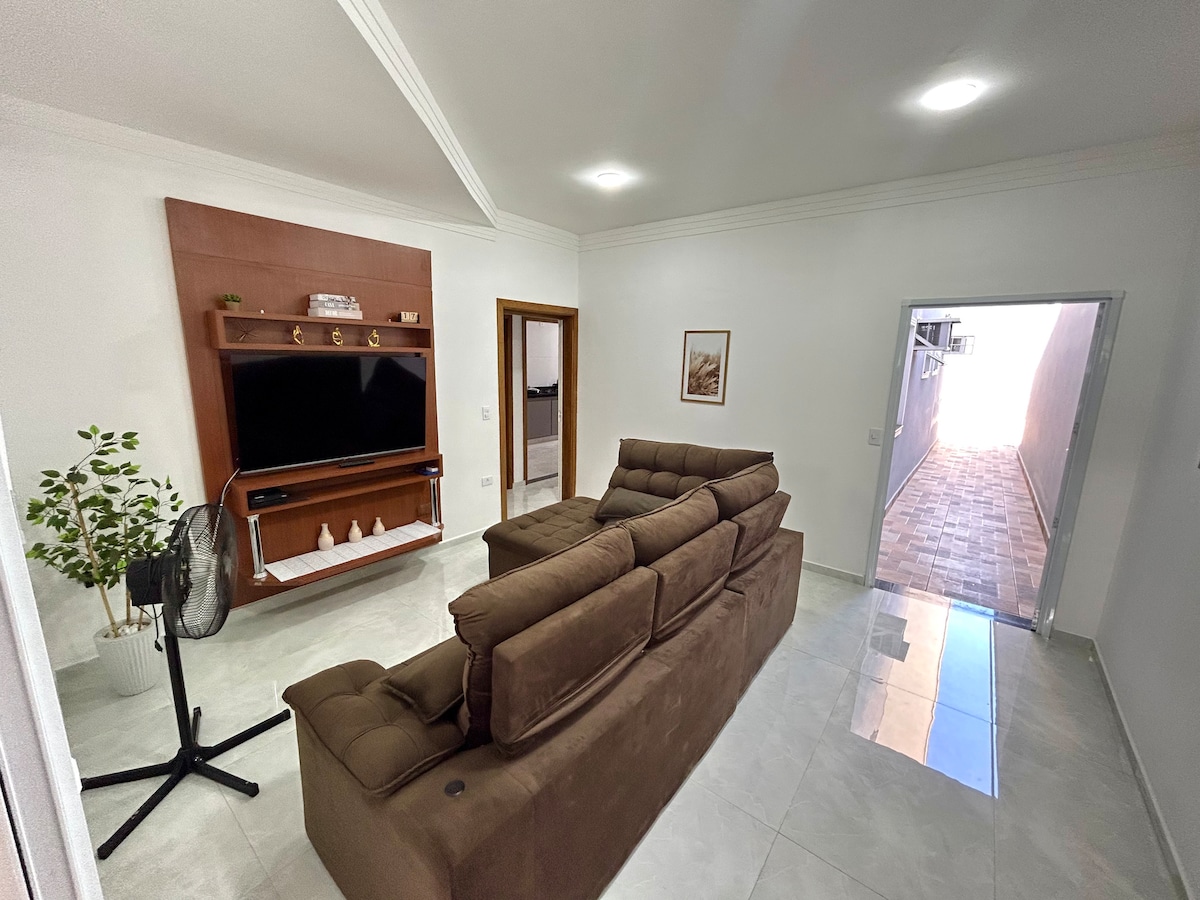 Casa acogedora para hasta 10 personas, a solo 1 cuadra de la Playa Martim de Sá y a 10 minutos de la Prainha. Cuenta con 3 dormitorios, 2 de ellos suites, y 3 baños en total. Dispone de piscina, parrilla, ducha externa y Alexa. Los dormitorios tienen aire acondicionado y ventiladores de techo. TV con todos los canales, Netflix, Globoplay, Prime Video y Max. Wi-Fi de 500mb en toda la casa. Cocina completa y estacionamiento para 3 autos con garaje y portón electrónico.
