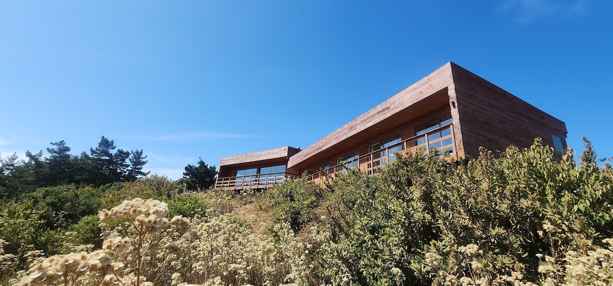 Bienvenidos a nuestra hogar! Te invitamos a pasar una acogedora estadía. La casa tiene una ubicación preferencial, al frente a la playa a dos minutos a pie y una vista panorámica increíble hacia el bosque y una vista despejada al mar y las olas. Sobre las instalaciones, está full equipada para máximo confort, para que disfruten cada segundo de su estadía. Ésta cuenta con 1 pieza, baño, cocina americana, living, parrilla, hot tub, fogón, estacionamiento, wifi, y un agradable sonido del mar.