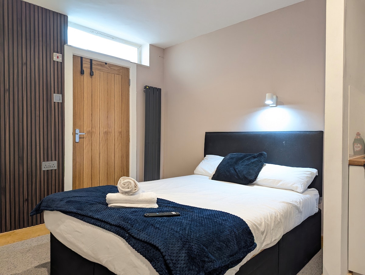 Este moderno apartamento de un dormitorio (no un estudio) puede alojar cómodamente hasta 4 huéspedes, ya que hay un sofá cama de primera calidad con un colchón de muelles ensacados de tamaño doble. Cuenta con todo lo que necesitas y más para una estancia agradable: cama tamaño king del Reino Unido, wifi (velocidad máxima de banda ancha: 10 mbps), lavadora/secadora, lavavajillas, nevera/congelador alto, vitrocerámica eléctrica, horno, TV de pantalla plana con Netflix, DVD, altavoz inteligente, microondas, hervidor de agua, tostadora, caja fuerte, plancha, secador de pelo, artículos de aseo, toallas, etc.