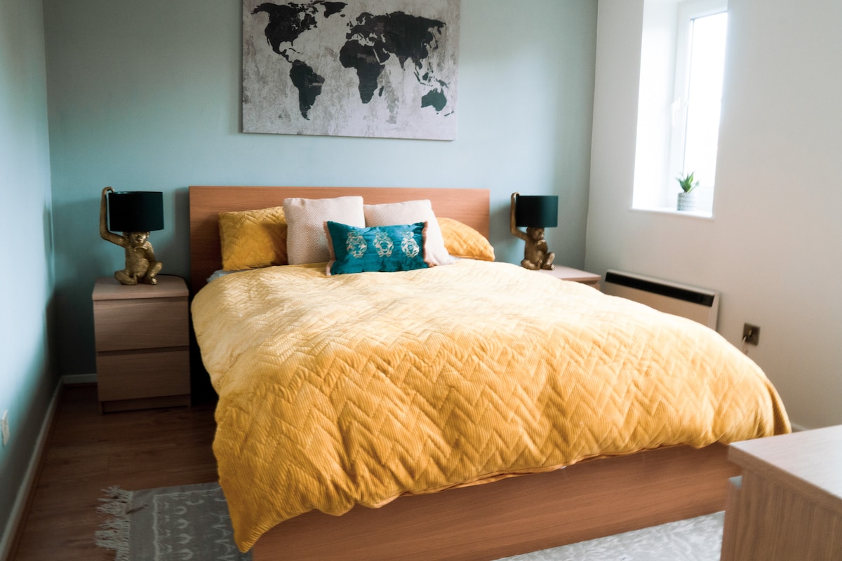 Apartamento amplio, luminoso y perfectamente situado en la planta superior en la bahía de Cardiff con estacionamiento seguro. Cuenta con 1 cama tamaño king y 1 dormitorio doble. ¡Se puede reservar como una estancia de 1 o 2 camas, por lo que es perfecto para parejas o amigos que visitan Cardiff! A 5 minutos a pie de la bahía de Cardiff y del Centro del Milenio de Gales. A 5 minutos en taxi o 15-20 minutos a pie del centro de la ciudad, incluido el estadio del Principado y el Estadio Utilita. También se puede acceder a través de la cercana estación de tren de la bahía de Cardiff. ¡Alojamiento perfecto para un evento, trabajo o escapada a la ciudad!
