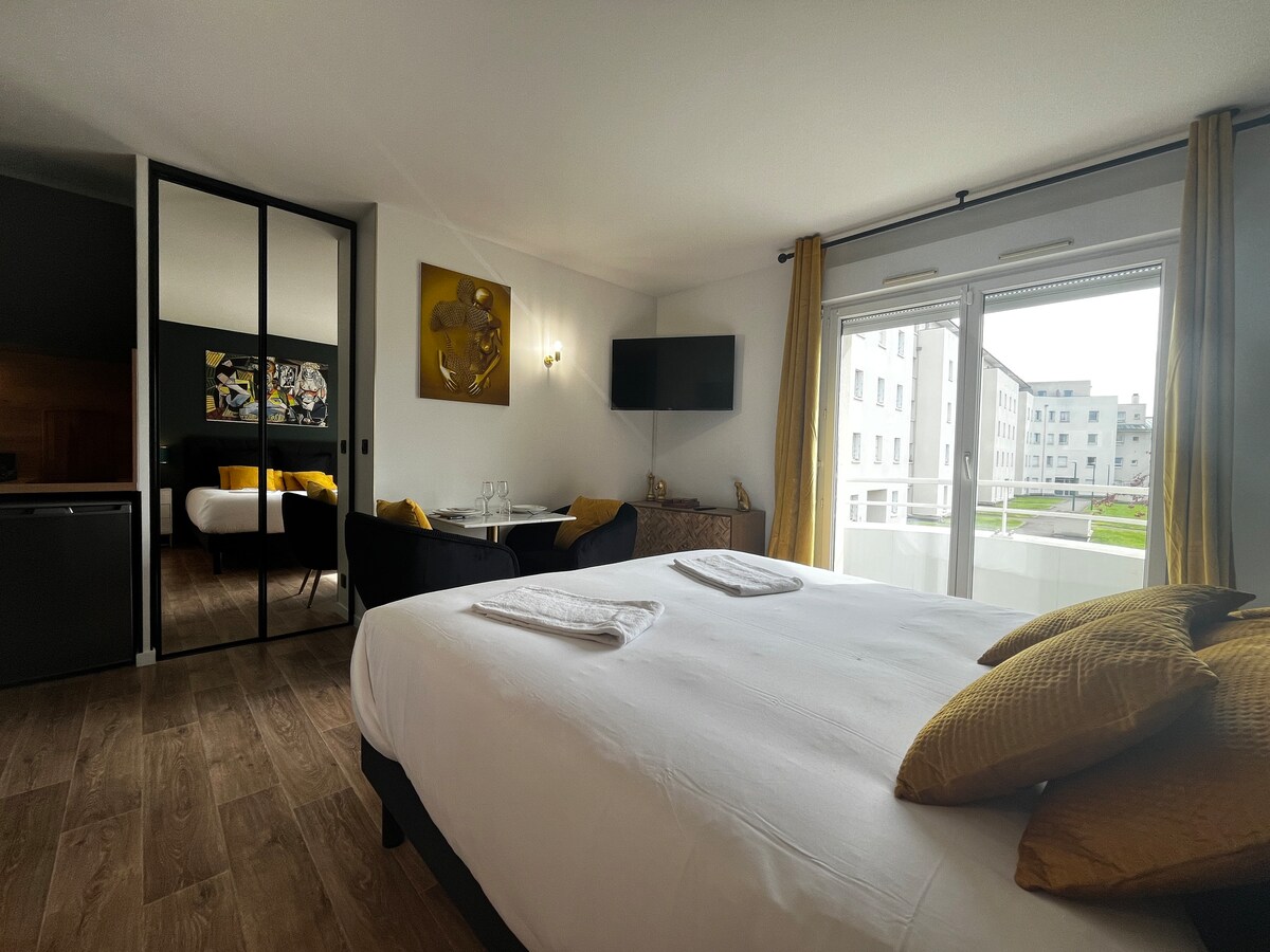 Disfrute de un alojamiento elegante y céntrico. Encantador apartamento situado en el tercer piso de una villa en el centro histórico. Tranquilo y soleado, con vistas abiertas a los jardines y al FRAC (Fondo Regional de Arte Contemporáneo), está consta de un dormitorio: cama de 160 cm, TV conectada / cocina totalmente equipada con zona de comedor / baño con bañera/ lavadero para la ropa. Persianas opacas en cada habitación. Acceso a la vivienda a través de un pequeño patio interior y entrada segura.