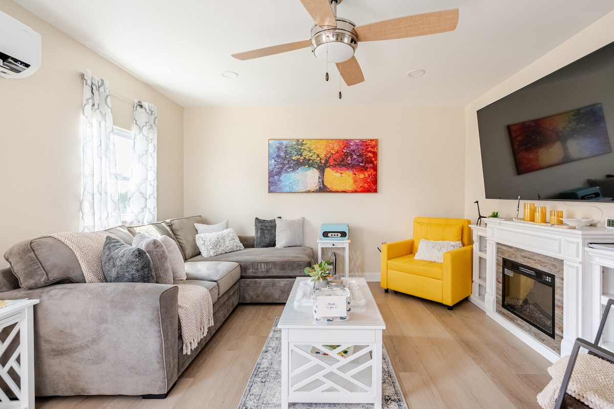 CW Villas at Fairfield |2BR/2BA King Balcony Suite • Tamaño: 965 - 1230 • Cocina: completa • Baños: varía • Capacidad: 6 huéspedes • Camas: Cama tamaño king - 1 sofá cama tamaño queen - 1 Varía Servicios de la habitación • Parrilla para barbacoa (exterior) - Ventilador de techo: secador de pelo. • Lavadora/secadora en la unidad • Reproductor de DVD • Televisión • Acceso a Internet Wi-Fi • Balcón/patio • Chimenea • Bañera de hidromasaje