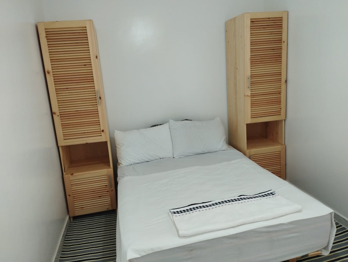 La habitación en el primer piso de la casa de huéspedes en El Jadida es una opción cómoda y conveniente para los viajeros. Aquí hay una descripción actualizada de esta habitación: La habitación, con una superficie de unos 12 m2, se encuentra en el primer piso y tiene una ventana con agradables vistas de los alrededores. Está amueblada con una cama espaciosa que mide 1,90x1,45 m . Se proporcionan sábanas limpias y suaves para garantizar un sueño cómodo durante su estadía y dos sillas y una mesa.