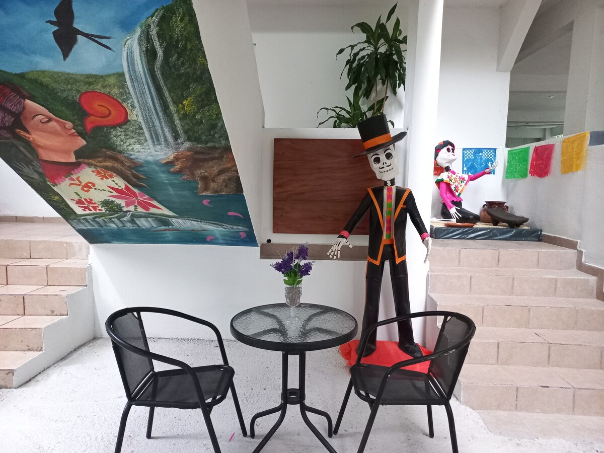 Bonito departamento en la terraza de céntrico edificio de departamentos turísticos. Adaptado en lo que en alguna época fueron viviendas. Ideal para descansar después de un intenso día de Aventuras en la Huasteca. El espacio de la terraza es ampliamente disfrutable donde incluso podrás asar carne y con el mobiliario básico para disfrutar al aire l Es importante mencionar que el techo tiene una altura máxima de 1.88 mts., por lo que se recomienda solo para personas de estatura menor a 1.87 mts.