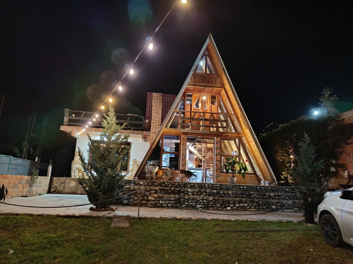 Hermosa cabaña de 2 pisos, ideal para 4 personas, con 2 habitaciones, 2 baños, cama king zise, malla catamarán, cocina, yacuzzi, zona barbacoa. Extraordinaria vista a uno de los picos más altos de los farallones de pance.