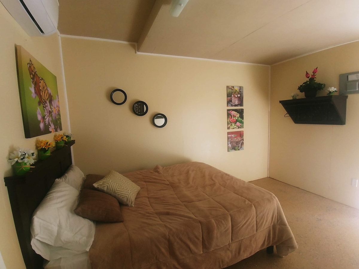 Descubre la tranquilidad y la comodidad en esta encantadora casa de campo con jardín. Ubicada en un hermoso jardín, nuestra casa es pintoresca y acogedora. Equipado pensando en tu comodidad. Ofrecemos senderos naturales, tubing en el río, yoga y masajes, además de la oportunidad de relajarse en hamacas. Ubicado en el encantador pueblo de Bullet Tree, a solo 10 minutos en coche de San Ignacio. Se puede llegar fácilmente en taxi local. Escapa del bullicio de la ciudad y disfruta de un gran punto de partida para todas tus aventuras en el interior de Belice.
