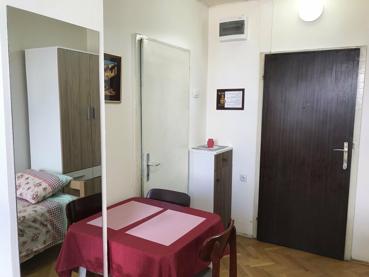 El apartamento contiene: 1. Baño: - Calentador de agua - Respirador - calefacción - toallas - Jabón - Gel de ducha - Champú - zapatillas - Papel higiénico 2. Cocina: - Agua caliente - Nevera - Minihorno - Tostadora - platos, cucharas, tenedores, cuchillos, vasos, ollas y sartenes 3. Sala de estar/dormitorio - Aire acondicionado. - Calefacción central. - Wifi súper rápido gratuito - Una televisión con más de 50 canales (como Arena Sport 1, tv 1000, Fox Life, etc.). - Dos camas individuales. - Una mesa. - Un armario. - una plancha - Un secador de pelo - Mantas y sábanas