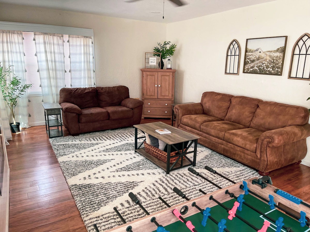 Deja que este sea tu hogar lejos de casa. Disfruta de tu estancia limpia y cómoda en este alojamiento familiar. Esta casa es engañosamente grande y espaciosa. Incluye un gran patio trasero para aparcamiento adicional. En el interior encontrarás 2 dormitorios con cómodas camas de felpa, un baño, una gran cocina y comedor, junto con una amplia sala de estar que ofrece un sofá cama para personas adicionales. Cada dormitorio tiene su propia unidad de aire acondicionado. Ubicado en el centro de un barrio tranquilo, lo que hace que tu estancia sea agradable y cómoda.