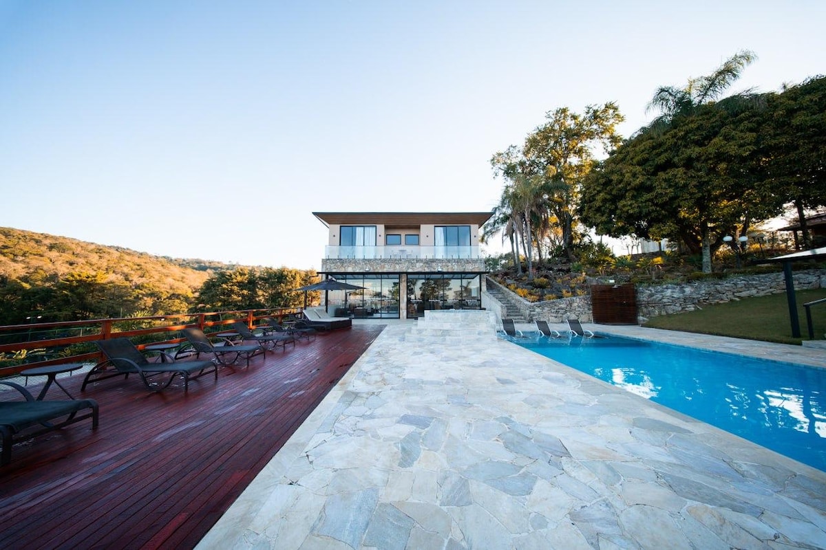 Un lugar único, moderno y refinado. Ofrece comodidad en medio de una vista deslumbrante. Reflejando la sierra y el cielo de Pirenópolis, con mucha comodidad y un estilo que ofrece refinamiento y tranquilidad. Situado en la zona rural de Pirenopolis, a unos 25 minutos del centro. El lugar ofrece: - Piscina con borde infinito - Bañera de hidromasaje - Cocina moderna - Zona gourmet - Hamaca con vista panorámica - Deck - Río, a 5 minutos a pie - Senderos …