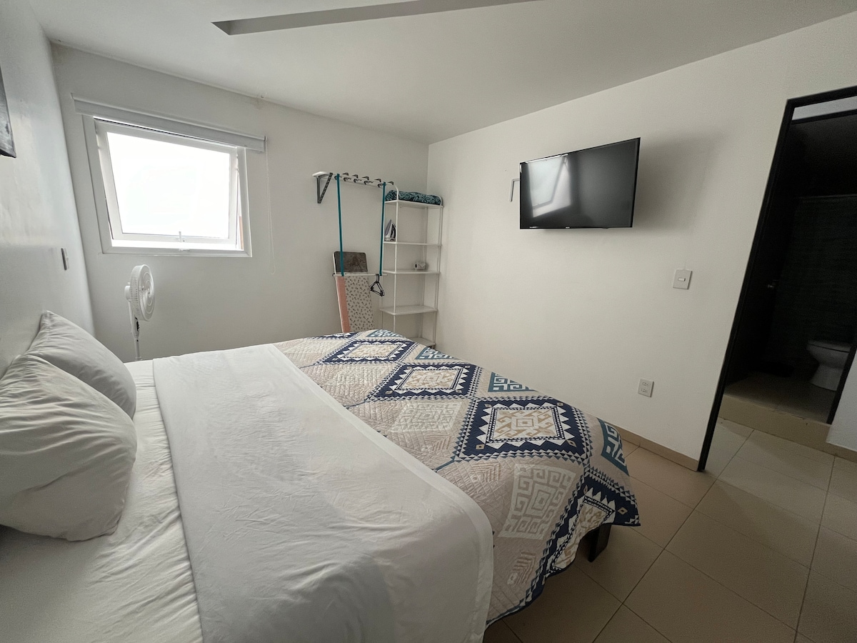 El Loft cuenta con cama tamaño KING SIZE (buen colchón), TV de 43", closet amplio y cocineta con parrilla de gas, utensilios de cocina, vasos, platos, cubiertos. La Habitación cuenta una ventana grande con vista panorámica el horizonte de la ciudad. Si traes vehículo puedes estacionarte afuera o a un lado del edifico, el barrio es muy tranquilo o existe una pensión a 2 cuadras ($80 la noche de 8 p.m a - 8 a.m ) El baño, cocineta, sala y cama son PRIVADAS. (no se comparten con nadie).