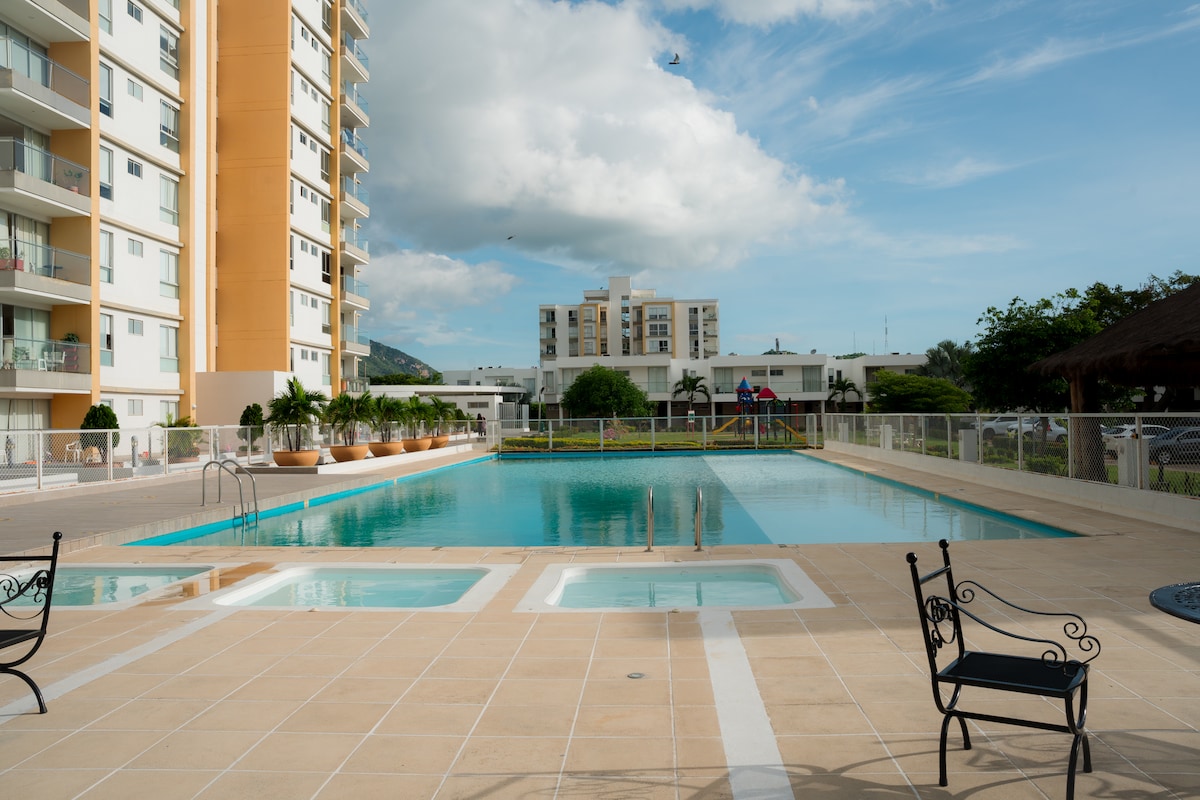 Excelente ubicación, un espacio ideal para disfrutar, una buena ambientación, aire acondicionado, contamos con una decoración espectacular, te vas a sentir como en casa. Cuenta con todos los utensilios básicos, elegante y sobrio excelente vista desde el balcón directo a la serranía, un espacio tranquilo y seguro, contamos con vigilancia las 24 horas del día porteria y servicio de parqueadero