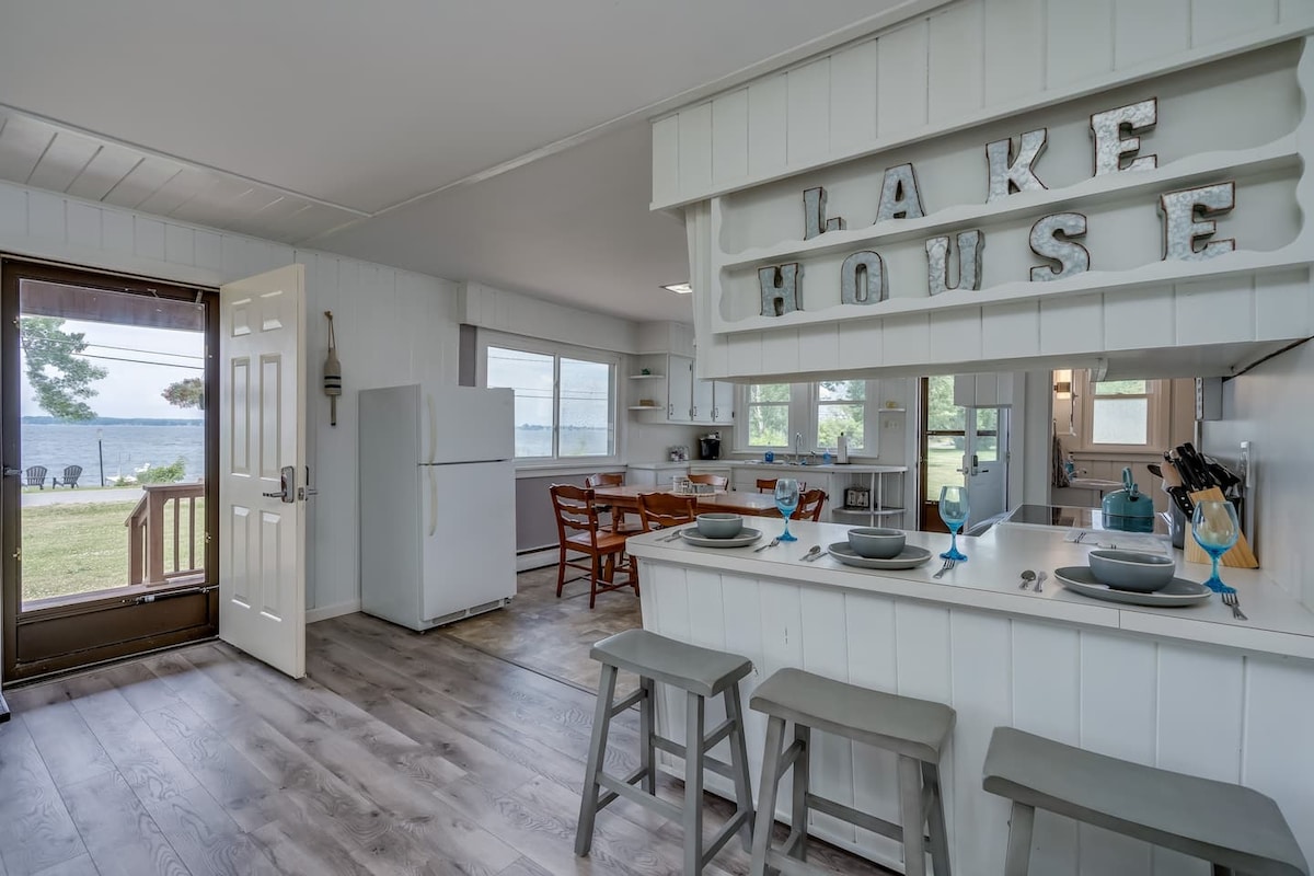 Relájate en esta tranquila propiedad frente al lago. Esta casa del lago se encuentra en un hermoso paseo marítimo de 100 pies con acceso a la playa rocosa nivelada, un plano de planta abierto y vistas increíbles de la bahía de Chaumont. Cuenta con una cama tamaño king en el dormitorio principal y el segundo dormitorio tiene una cama tamaño queen y una cama individual. El sofá de la sala de estar se convierte en una cama completa. Dos baños completos para ti y tu familia. La tranquilidad te dejará relajado mientras estás cerca de todos los servicios locales que ofrece la zona.